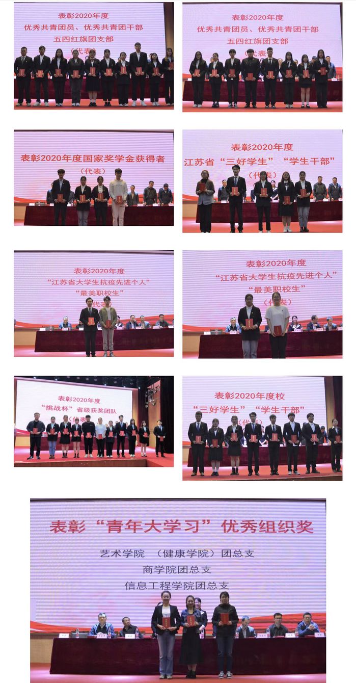 大会在雄壮的国歌声中拉开帷幕。校团委副书记尹星宣读了《关于表彰2020年度“优秀共青团员”“优秀共青团干部”“五四红旗团支部”的决定》《关于对2020年度国家奖学金获得者的表彰通报》《关于对2020年度江苏省普通高校省级三好学生、优秀学生干部获得者的表彰通报》《关于对2020年度“江苏省大学生抗疫先进个人”及“最美职校生”的表彰通报》《关于对2020年度第十一届“挑战杯”省级获奖团队的表彰通报》《关于表彰2019-2020学年“三好学生”“优秀学生干部”的决定》和《关于表彰“青年大学习”优秀组织奖的决定》等表彰文件,对2020年我校共青团组织中表现突出的集体和个人进行了表彰。