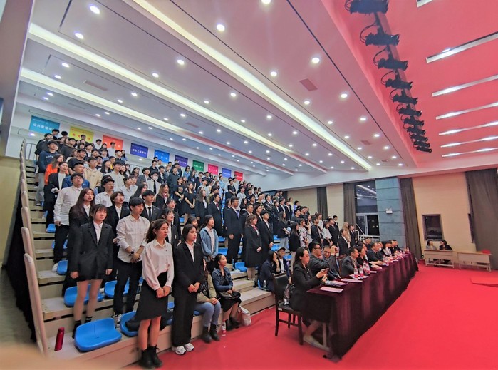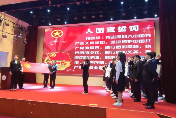 在入团宣誓环节,台上新团员在团旗下,严肃且庄重地进行入团宣誓;台下老团员全体起立,重温入团誓词,牢记团员使命。会场上铮铮誓言铿锵有力,庄严承诺掷地有声,激发全体团员青年坚定理想信念,弘扬“五四”精神,努力拼搏的决心。
