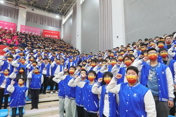 全体新生在校学生会主席团执行主席丁宇同学的带领下,举起右臂庄严宣誓,青春向党,奋斗强国。