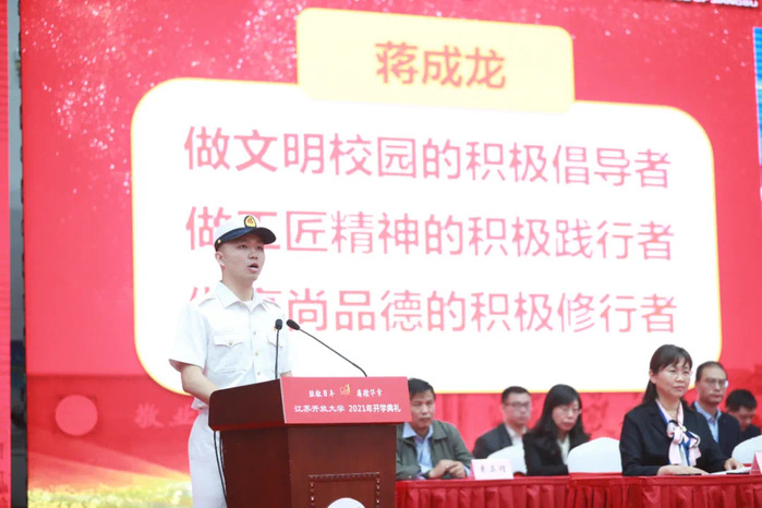 新生代表先后发言。2021级土木工程专业开放学员、南京南大智慧城市规划设计股份有限公司副院长闫飞同学用一路拼搏,孜孜求学的经历告诉同学们要养成终身学习的好习惯,才能为绚烂人生做更好的准备。建筑工程学院2021级建筑智能化技术专业蒋成龙同学表态要将军人的情怀和品质融入到校园生活中,用实际行动和责任担当,展现新时代大学生的风采。