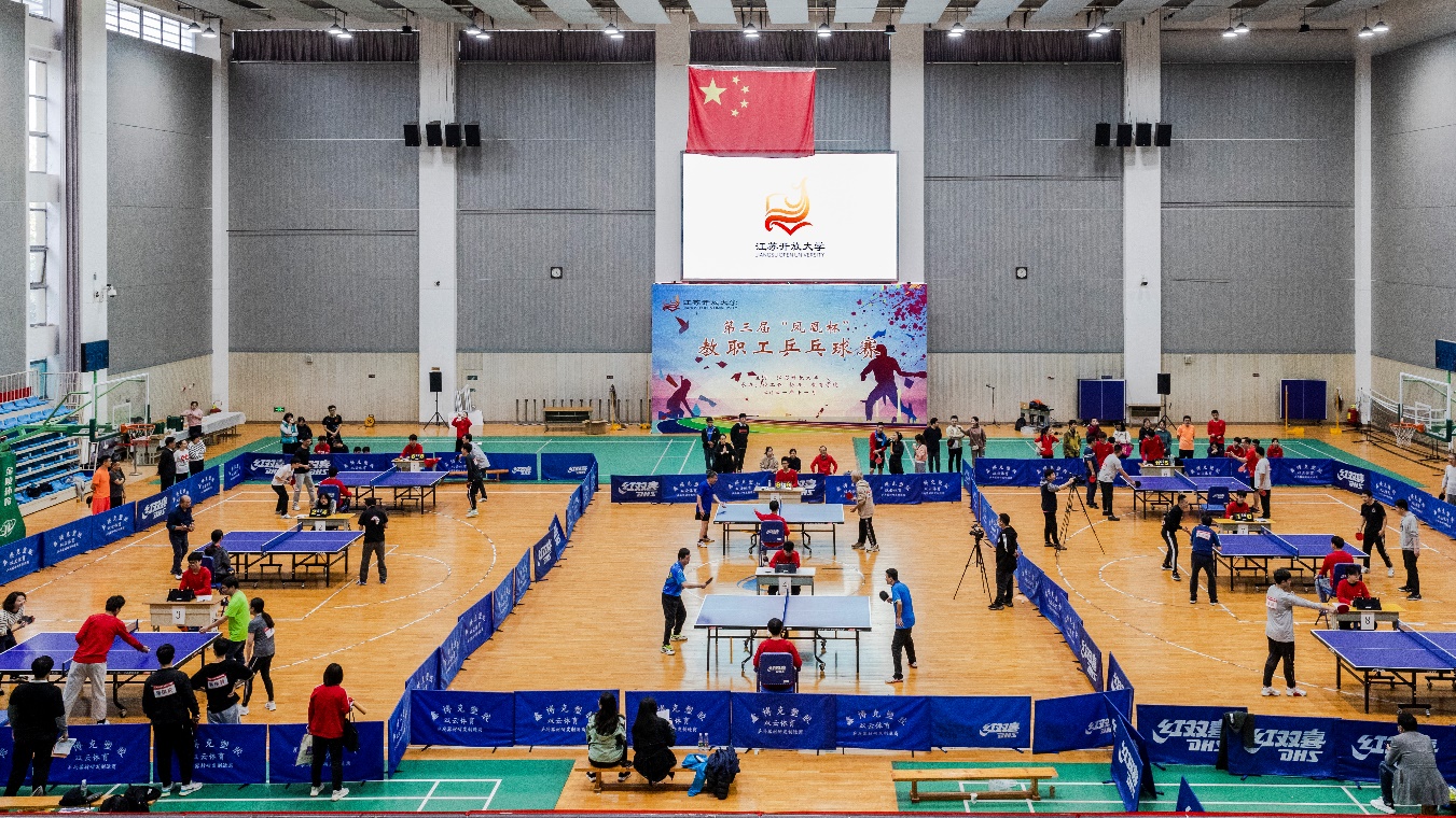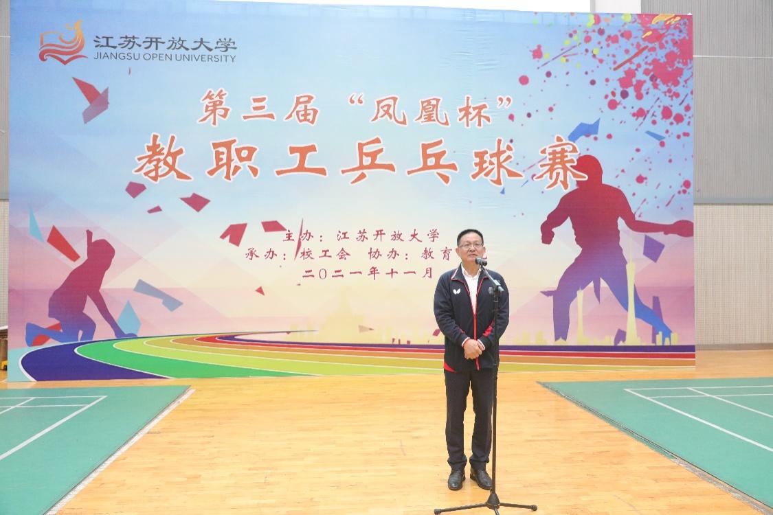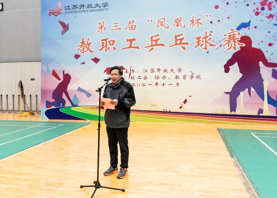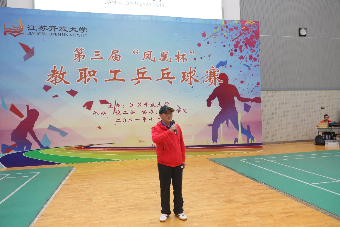 2021年11月20日,学校第三届“凤凰杯”教职工乒乓球赛在应天校区体艺馆举行。各分工会和退休教职工组成的13支参赛队,近200名师生参加了活动。校党委书记王建明宣布开幕,校长崔新有致闭幕词。