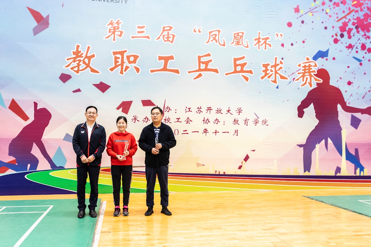 最终,商学院代表队获团体赛第一名,环境生态学院和建筑工程学院代表队分获第二、三名。男子打单冠军由机关分工会孙旭摘得,机关分工会徐亚斩获女子单打冠军。