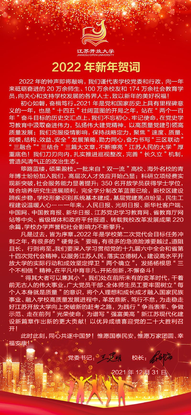 党委书记王建明、校长崔新有2022年新年贺词