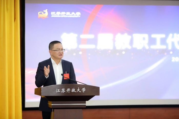 上午的大会上,校长崔新有作了题为“自信团结 接续奋斗 开创‘江苏人民的大学’美好未来”学校工作报告。报告从党史学习教育扎实开展、巡视整改工作着力推进、招生就业工作提质增效、学科专业建设佳报频传、师资队伍建设务实有力、科学研究水平再上台阶、文化名校工程结出硕果、服务乡村振兴成为样板、社会培训体系夯基垒台、学分银行四通八达、民生工程凝聚人心、依法治校多点开花等十二个方面回顾和总结了学校2021年取得的成绩。明确了2022年党的建设、人才引进、学科建设、完全学分制改革、科学研究、“智慧教育生态”、新校区建设、文化建设等八个方面的重点工作。崔校长强调,2022年唯有不忘为党育人、为国育才的初心使命,保持中流击水、奋楫者进的昂扬斗志,直面机遇和挑战,一茬接着一茬干,一棒接着一棒传,才能最终实现建设高水平开放大学、服务全民终身学习的宏伟事业,办成“江苏人民的大学”!