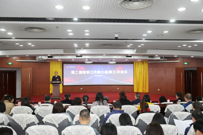 3月2日,学校第二届教职工代表大会第三次会议在定淮门校区二楼报告厅召开。来自6个代表团122名正式代表、列席代表参加了大会,校党委常委、副校长尤佳春主持会议。