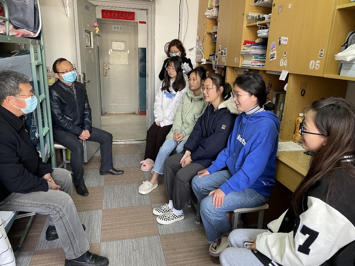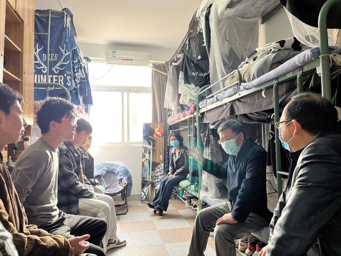 王书记深入到4间学生宿舍。他以师长的身份,通过对同学们家乡、学习和生活的关怀,迅速拉近了与学生的距离。王书记重点了解了每个宿舍宿舍长和值日生的分工职责、宿舍团小组活动的开展、宿舍成员间的关系等情况。他与同学们促膝长谈,勉励他们要珍惜大学集体生活时光,做好未来的学业规划。离开宿舍前,王书记还看了看学生的床褥厚不厚、门框脏不脏、鞋子齐不齐,从细节中了解学生的生活和卫生情况。