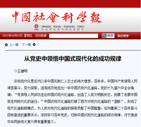 王建明在《从党史中领悟中国式现代化的成功规律》中提出:在两个百年交汇的重要历史紧要关头,我们必须深挖第一个百年历史富矿,深刻总结经验,领悟中国式道路成功规律,继续走好中国式现代化道路,推进中华民族伟大复兴,全面实现社会主义现代化。