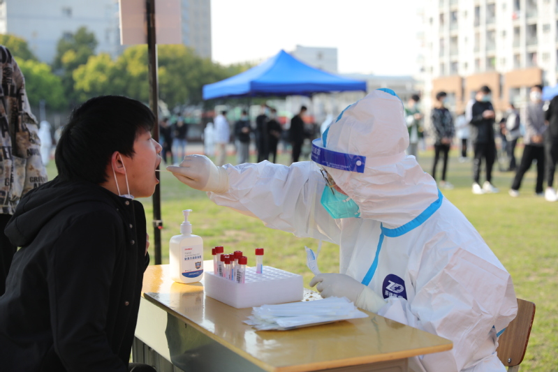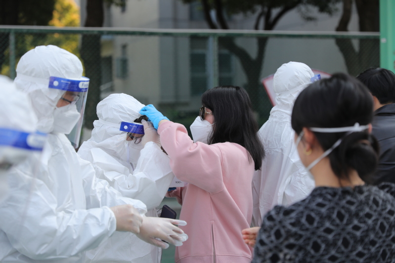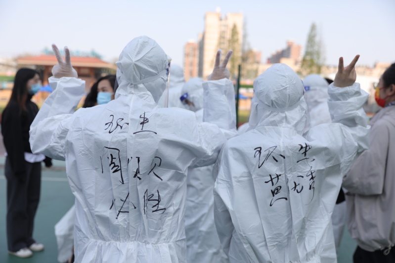 各学院还组织了党员志愿者先锋队,分赴扫码岗、检测队伍秩序维持岗、入口引导岗和出口引导岗,体现了党旗飘在一线、堡垒筑在一线、党员冲在一线的要求。崔新有在应天校区现场为志愿者们穿戴和整理防护服,并对他们的工作表示了充分的肯定。