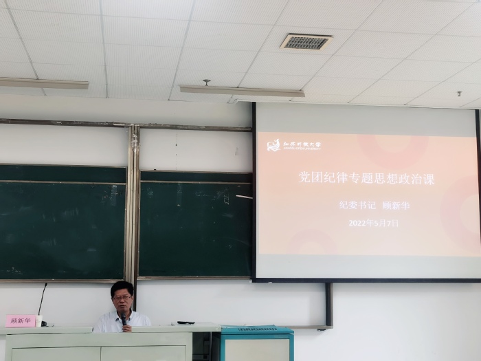 顾新华通过解读党章、团章、中国共产党纪律处分条例、中国共产主义青年团纪律处分条例(试行)等重要法律法规相关内容,教育青年学生要不断增强知敬畏、存戒惧、守底线意识,共青团员必须自觉接受团的纪律的约束,共产党员必须自觉接受党的纪律的约束,自觉树立和践行社会主义核心价值观,争做堪当民族复兴重任的时代新人。