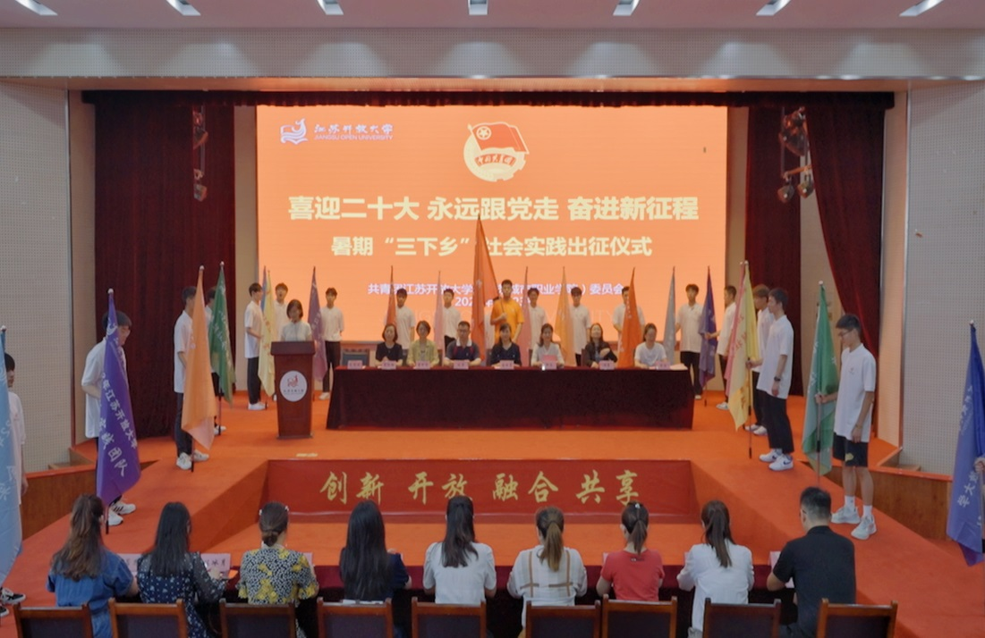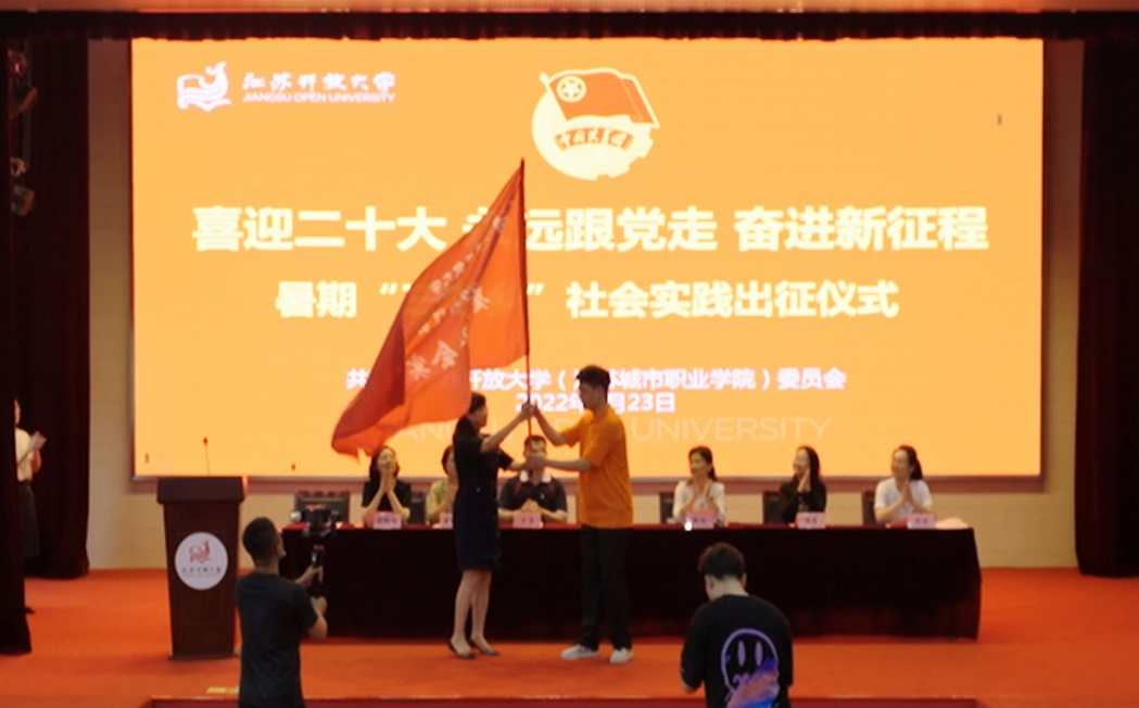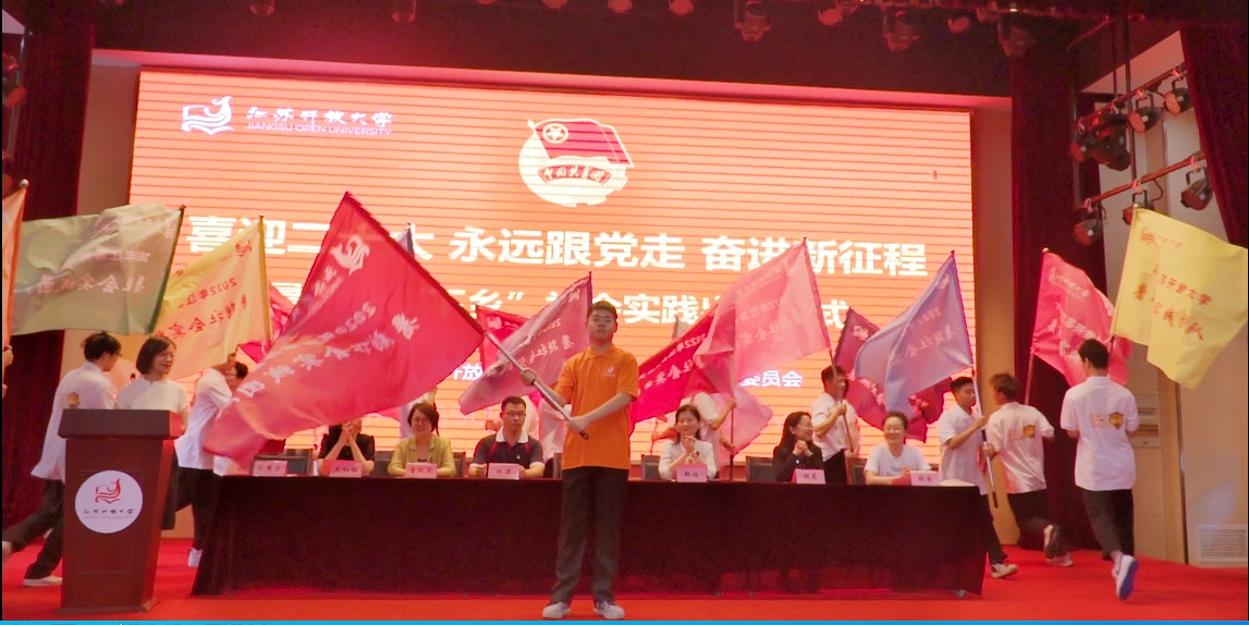 金丽霞在仪式上作动员讲话并给实践团队授旗。她首先肯定了学校各级团组织近年来暑期社会实践活动取得的成绩。她认为,今年的暑期社会实践活动方案围绕学校中心工作,贴近青年学生,发挥市县开放大学体系优势,组织开放学员与高职学生共同参加,非常有意义,希望同学们要勇于肩负使命,牢记习近平总书记“在为人民服务中茁壮成长”的期盼,培养家国情怀,将自身追求与中国梦相融、与学校发展相融;要善于团结协作,牢记习近平总书记“在实践中增长工作本领”的嘱托,扎根基层,在实践中读好社会这本“无字之书”;要敢于担当逐梦,牢记习近平总书记“在艰苦奋斗中砥砺意志品质”的教诲,勇于吃苦奉献,在为祖国奉献的历程中挥洒青春汗水;要加强安全意识、合作意识、宣传意识,安全有序完成实践任务,不断拓展社会实践基地,搭建学生从学校到社会的桥梁,提升我校社会实践的品牌传播度和社会影响力。同学们要用脚步丈量祖国大地,用眼睛发现中国精神,用耳朵倾听人民呼声,用内心感应时代脉搏,把对祖国血浓于水、与人民同呼吸共命运的情感贯穿学业全过程、融汇在事业追求中。