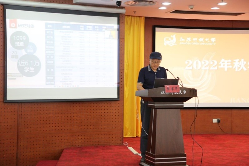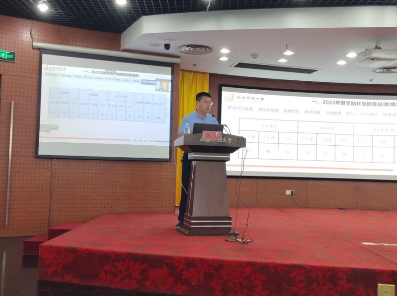 在开放教育教学运行工作汇报与培训环节,沈宏从基本教学运行数据、教学团队情况、教学检查、作业批改以及学生学习行为分析、考试和毕业论文工作等几个方面,全面总结了2022年春学期开放教育教学工作开展情况。随后,他代表教务处对2022年秋学期课程负责人的管理要求、工作流程与时间节点进行了解读和布置,并从“思政课程”和“课程思政”教学改革、学校形象识别系统(UIS)有机融入教育教学、实验实训教学模式探索、线下教学改革、开放教育教材选用五个方面对学院和各课程负责人新学期教学工作提出了意见与建议。