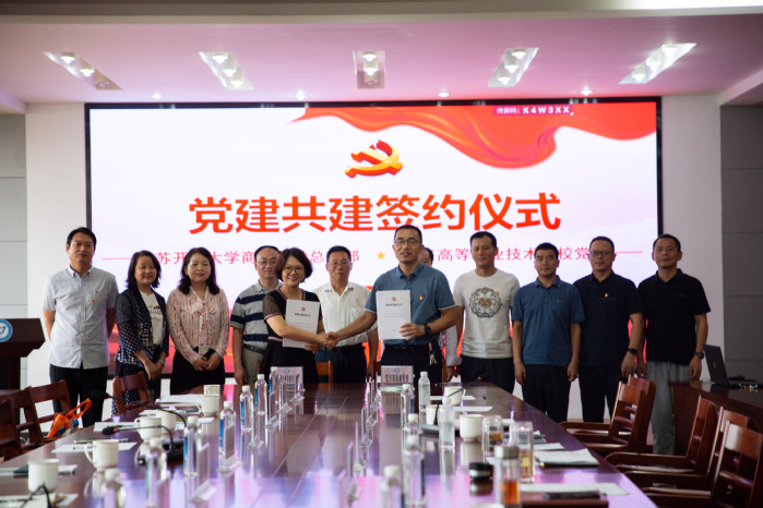 宜兴开放大学党委书记、校长刘炜杰,宜兴开放大学副校长管燕强分别从学校UIS文化宣贯、校友和就业工作、开放学员的思想政治教育推动情况进行了工作汇报。会上,江苏开放大学商学院党总支部与宜兴高等职业技术学校党委举行了党建共建签约仪式。