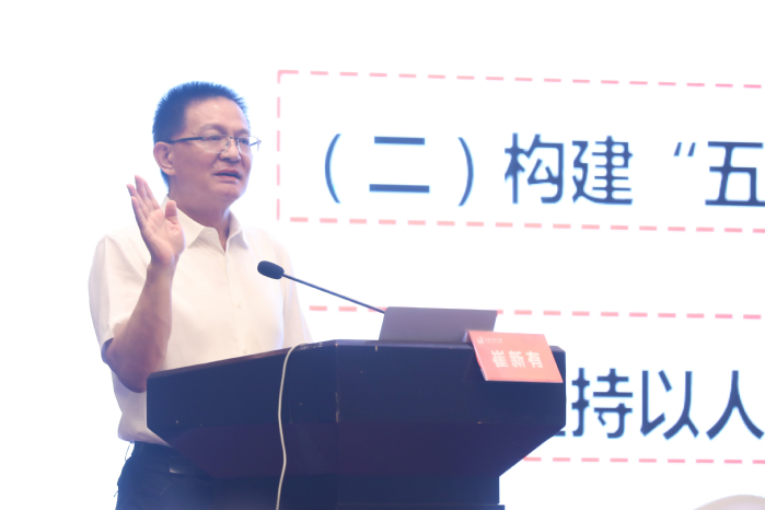 校党委副书记、校长崔新有作主题报告。崔校长以《如春在花 如盐化水 构建江苏开放大学“五育并举”新格局》为题,从“五育并举”的本质内涵、逻辑理路、根本遵循着手,为大家厘清了“五育”和立德树人的紧密关联,并从实践策略角度就构建江苏开放大学办学系统一体化“五育并举”新格局作出具体部署。他立足江苏开放大学体系“多元化主体”的办学格局和职责使命,以陶行知、钱钟书、王元化等人为例,生动形象地阐释了德、智、体、美、劳对于立德树人、培根铸魂、终身学习的重要性。他指出,思想政治工作归根结底是做“人”的工作,要以“人民”为中心,用实际行动践行“国之大者”,引导全体师生树立正确的世界观、人生观、价值观。他强调,增强凝聚力是开展思想政治工作和推动学校和谐发展的核心,省市县(区)开放大学要进一步统一共识,汇聚力量,守好责任田,打好组合拳,共同构建以江苏开放大学为龙头,以市县(区)开放大学为骨干的高质量开放教育体系,为全民终身学习贡献“江苏力量”。唯改革者进,唯创新者强,唯改革创新者胜!全体同志要拧成一股绳,繁荣“五育”生态,发挥“并举”实效,为培养出“德行高尚、充满智慧、身体强健、审美高雅、勤于劳动”全面发展的优秀人才而不懈奋斗!
