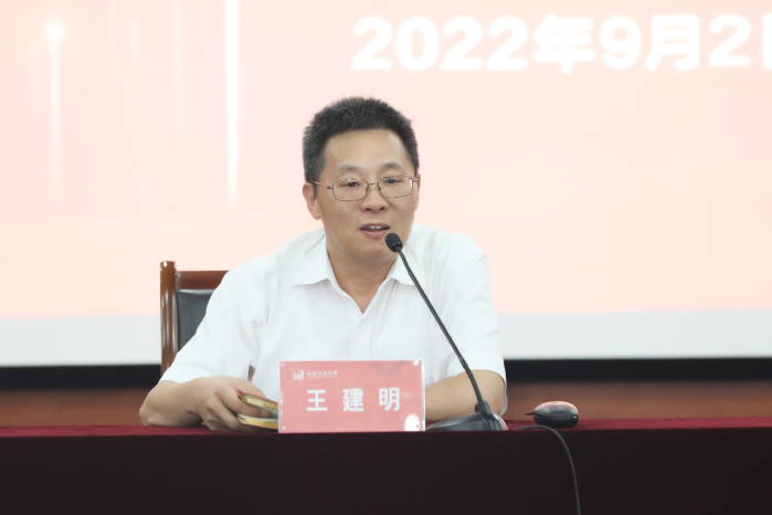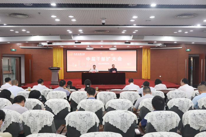 “全党必须增强忧患意识,坚持底线思维,坚定斗争意志,增强斗争本领,以正确的战略应变局、育新机、开新局,依靠顽强斗争打开视野发展新天地,最根本的是要把我们自己的事情做好。”习近平总书记在省部级领导干部专题研讨班上发表的重要讲话近日在各领域引起强烈反响。9月2日下午,我校召开2022-2023年度第一学期中层干部扩大会,在学习习近平总书记重要讲话精神基础上,增强忧患意识,锤炼过硬本领,脚踏实地坚持“做好自己的事”。党委书记王建明主持会议,党委副书记、校长崔新有作专题报告。全体校领导、全体中层干部、内设机构负责人及党支部书记参加会议。
