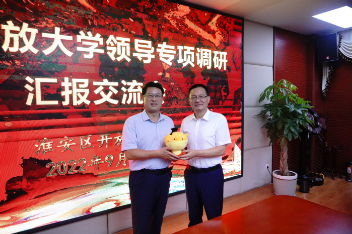 崔新有一行首先来到淮安区开放大学,参观了学校现代信息技术实训基地,调研学校形象识别系统文化宣传贯彻等情况,并与淮安区人民政府、淮安区教体局、淮安开放大学、淮安区开放大学、盱眙开放大学的有关负责同志及相关人员进行了座谈交流,座谈会由淮安区教体局党委委员、系统工会主席孙青主持。