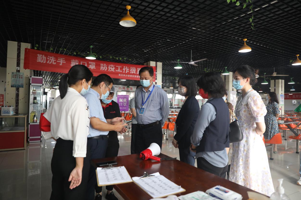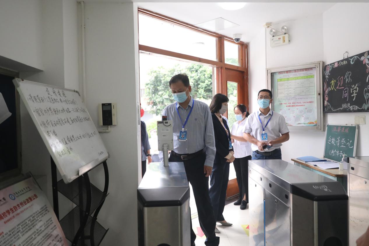 潘东标一行集中检查了我校学生宿舍、食堂、图书馆等场所,详细询问了我校后勤保障人员住校及健康管理、全员核酸检测、食堂用餐、环境消杀、防疫物资储备等疫情防控措施的落实情况。潘东标对我校疫情防控各项工作给予充分肯定。他强调,学校要继续严格按照上级和属地关于疫情防控工作的决策部署和工作标准,筑牢校园疫情防控安全屏障;并着重就校地协同做好重点人员的管理、核酸检测、隔离管控、新生返校疫情防控工作等提出明确要求。