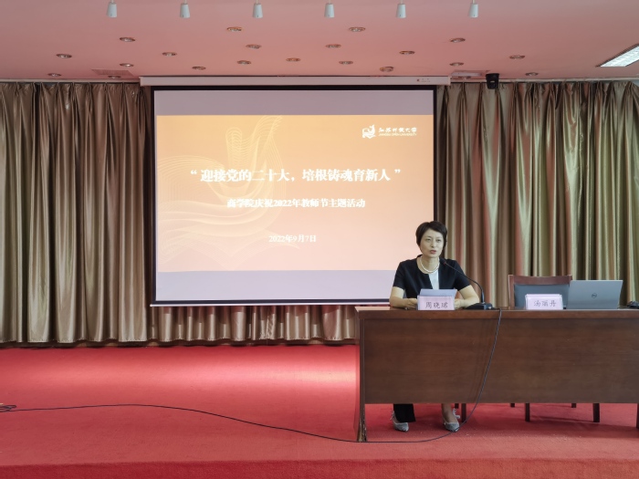 在党的二十大即将召开、第38个教师节即将到来之际,为表彰先进典型、进一步加强师德师风建设, 9月7日下午,商学院在东校区综合楼报告厅举办主题为“迎接党的二十大,培根铸魂育新人”庆祝教师节主题活动。活动由周晓珺院长主持,校党委书记王建明、商学院全体教职工参加活动。