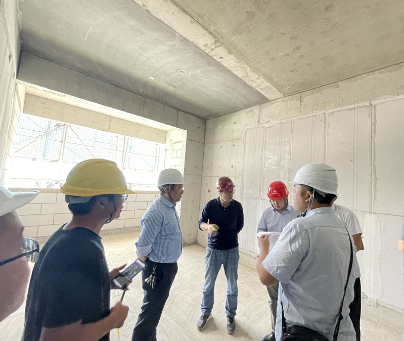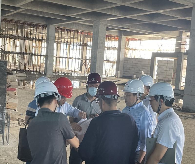耿焕同一行在现场仔细查看一期一标段项目建设情况,耐心询问项目建设进度、工程质量等情况,并与中通服设计单位一同查看了部分已封顶的学生宿舍楼、轮训公寓以及学生食堂等建筑智能化设计中管线管网开槽和信息点位预埋的施工情况,要求确保施工质量和安全前提下进一步加快施工进度。
