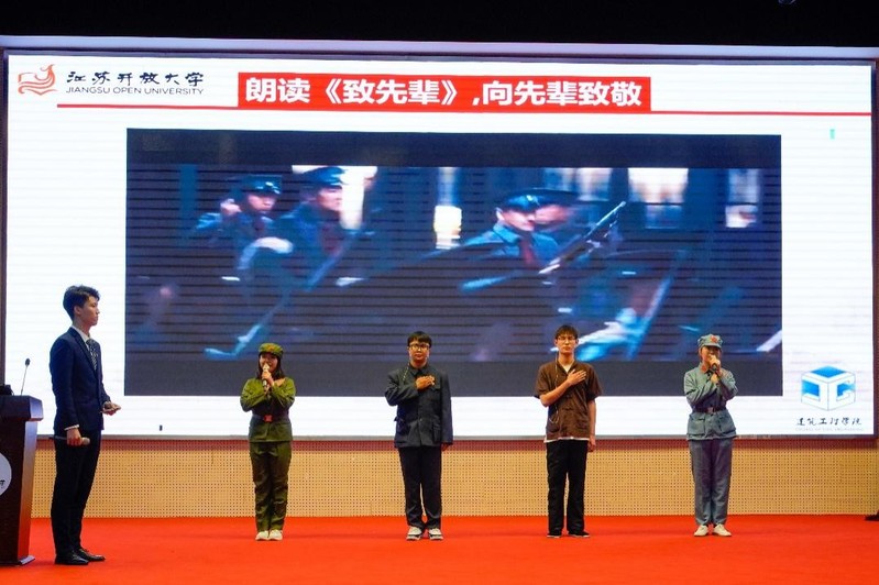 建筑工程学院团队代表结合汇报、表演等多种形式,叙述了他们线上线下结合学习周恩来精神、新四军“铁军精神”的活动,以及走入浦口区石碛社区未成年活动中心为留守儿童开展课外辅导的暖心事迹。