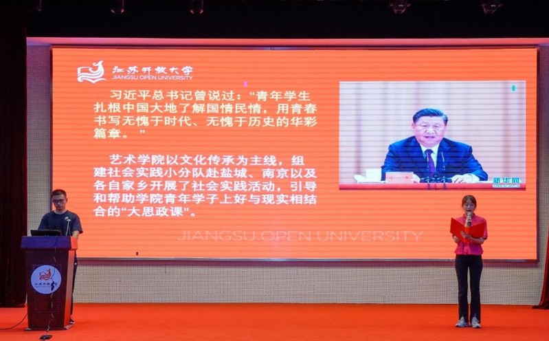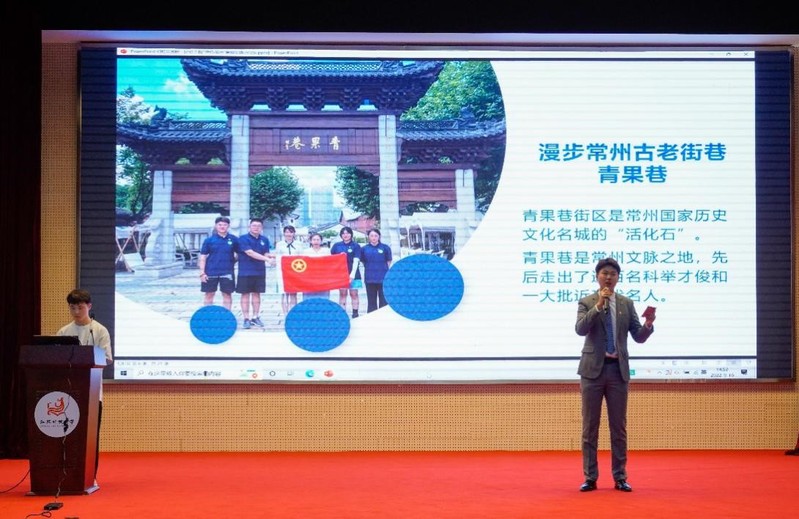 信息工程学院团队代表汇报了他们与常州开放大学学员共同走入张太雷纪念馆追寻团史印记,探寻非遗文化“乱针绣”名家狄静的匠人精神,走进夸克涂层科技公司校友企业的丰富多样的实践活动。
