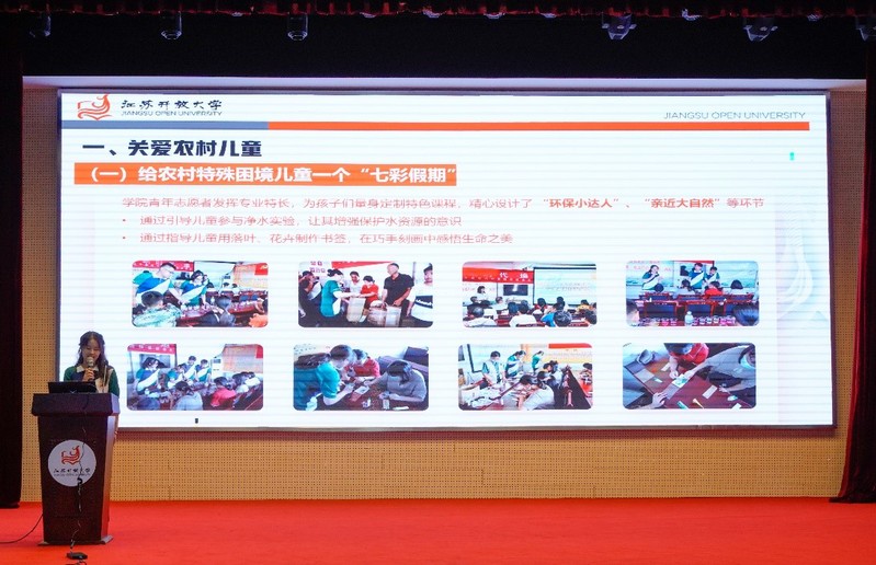 环境生态学院团队代表分享了他们与徐州开放大学一起去往邳州市宿羊山村用趣味实验带领留守儿童贴近自然,参与环保实验,前往潘安湖街道马庄村感受文化和产业振兴的典范力量的经历。