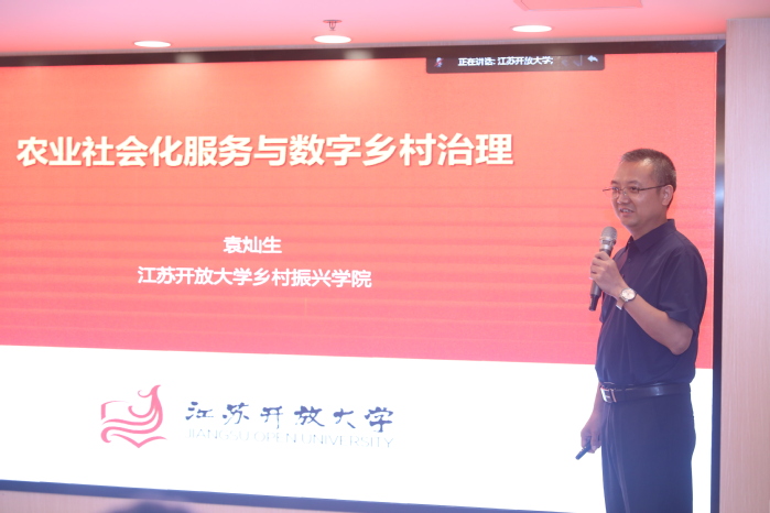 江苏开放大学乡村振兴学院院长袁灿生作专家报告《农业社会化服务与数字乡村治理》,报告从“三农”问题的核心本质与农业社会化服务发展历程入手,概括出推进数字乡村治理的重大意义和数字乡村治理的社会化特征,进一步提出健全的农业社会化服务体系是数字乡村治理的重要组织保障、广大农民参与基层治理的重要阵地。