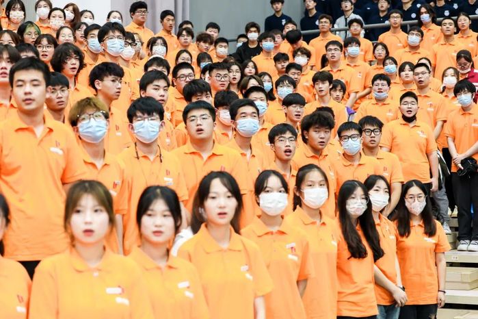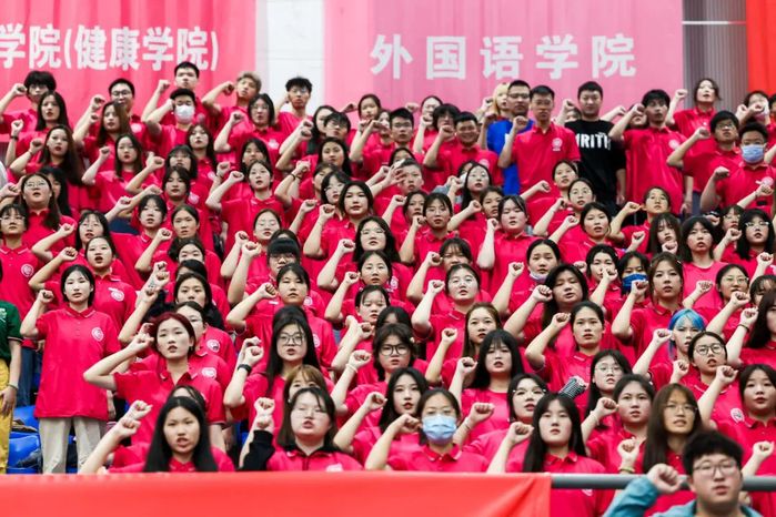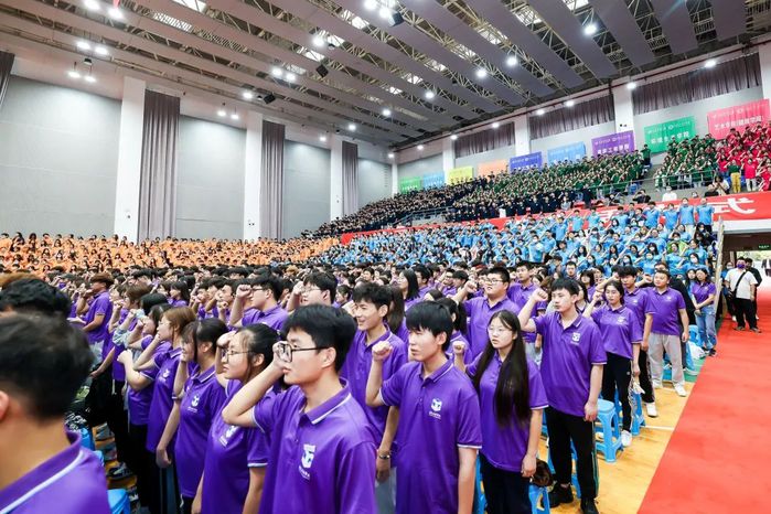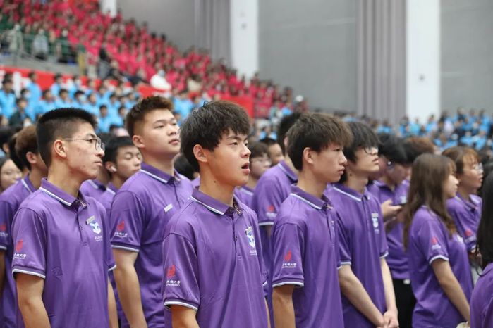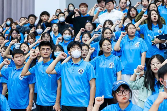 全体新生在校学生会轮值主席韩东旭同学的带领下,举起右臂庄严宣誓,青春向党,奋斗强国。
