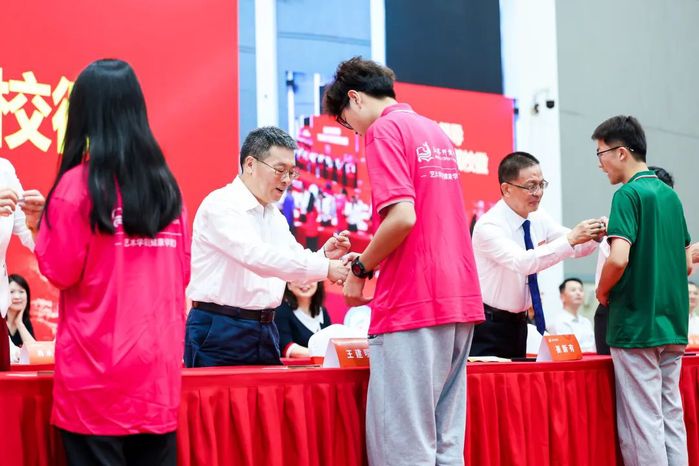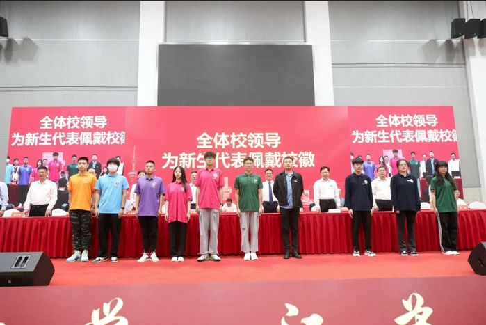 典礼上,全体校领导为2022级新生代表佩戴校徽。佩戴上校徽,同学们将共享“江苏开大人”这一承载着使命与光荣的称号,传承着“让学习成为一种生活方式”的校训,共同承担起国家与时代的责任。