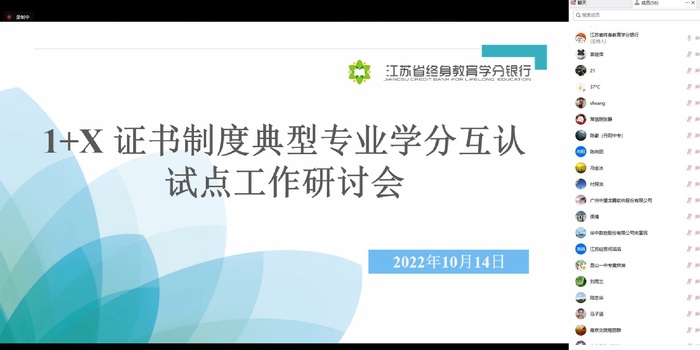 为贯彻《省委办公厅 省政府办公厅关于推动现代职业教育高质量发展实施意见的通知》文件精神,落实《省教育厅关于开展1+X证书制度典型专业学分互认试点工作的通知》要求,切实做好试点专业的学习成果认定标准研制工作,10月14日上午,江苏省终身教育学分银行管理中心在省教育厅指导下,组织召开了1+X证书制度典型专业学分互认试点工作线上研讨会。江苏省教育厅职业教育处主任万炜、江苏省教育科学研究院职业教育研究所副所长陈向阳、全省各试点专业项目主持单位代表、培训评价组织单位人员等50余人参加了会议。会议由江苏省终身教育学分银行管理中心主任张璇主持。
