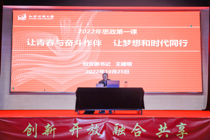 10月25日,校党委书记王建明教授以《让青春与奋斗作伴,让梦想和时代同行》为题,在应天校区体艺馆406室,为2022级新生讲授了一堂生动的“思政第一课”。校党委副书记、副校长金丽霞,有关部门和各党总支部负责人、全体思政课教师和辅导员与新生一起,现场聆听了这堂课。