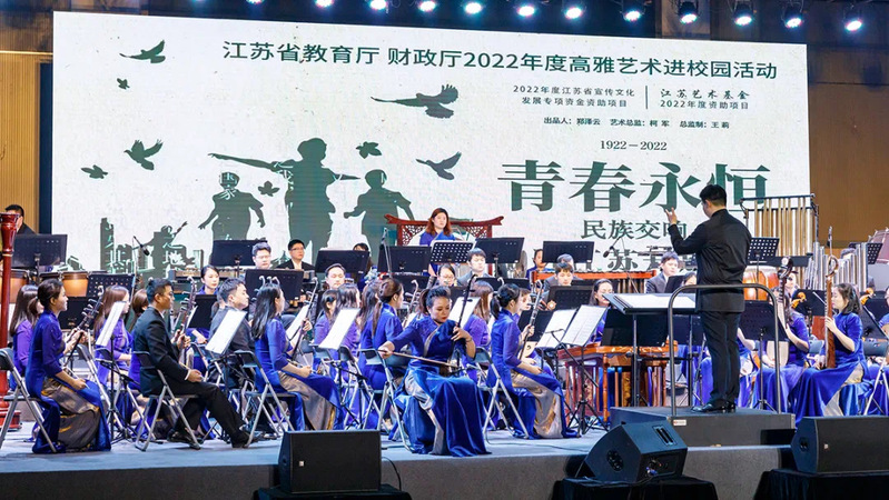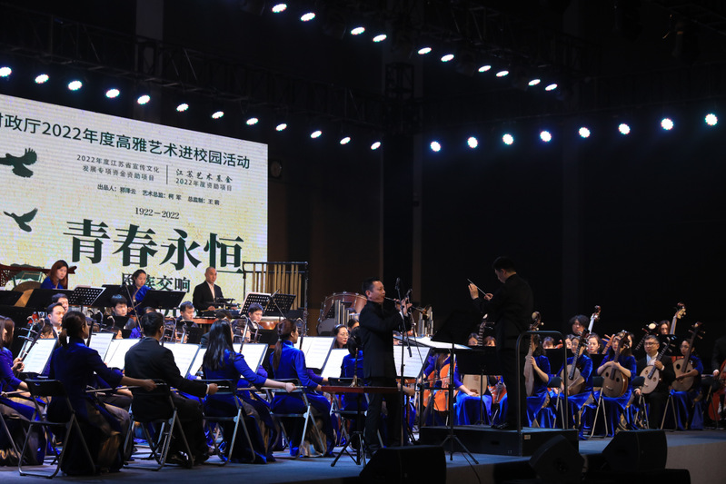 青春恰似火,扬帆正当时。11月16日晚,江苏省教育厅、江苏省财政厅2022年度高雅艺术进校园活动走进我校,江苏省演艺集团民族乐团为我校师生带来了“以民乐之美,颂青春之志”的原创民族交响《青春永恒》。校党委副书记、副校长金丽霞、中层干部、教师代表和800名学生共同聆听了此次音乐会。