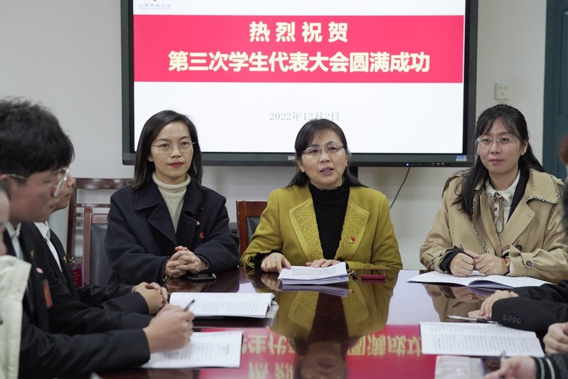 随后,金丽霞同志对新当选的委员与主席团成员提出了三点要求:一是要紧跟时代步伐。她指出,今日之中国正处于实现中华民族伟大复兴的关键时期,正面临世界百年未有之大变局。我校学子作为新时代中国青年组织的骨干力量,必须认真学习宣传贯彻党的二十大精神,要组织好广大青年和青年学生,奋力拼搏进取,回答好时代新课题。二是要把握青年工作的特点和规律。要以习近平总书记关于青年工作的重要思想为根本遵循,充分认清新形势下青年群众工作呈现出的新特点,主动适应形势的发展变化,不断探索青年群众工作的方式方法,努力把青年群众凝聚在党的周围。三是要深化改革创新。学生会是党的群团事业的重要组成部分。只有不断推进自身改革创新,认真履行自身职能,才能更好组织动员广大青年坚定地跟党走。