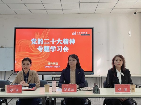 按照学校党委统一部署,近日,校党委常委、副校长罗逾兰,校党委委员、学校办公室主任杨濯,来到设计学院进行党的二十大精神专题学习宣讲。本次会议由设计学院党总支书记邹佳主持,采用线上线下相结合的方式进行。张家港开放大学设分会场,该校党委副书记陆盘忠以及宣传委员、各支部书记在腾讯会议视频端参加会议。设计学院全体教职工及学生代表线下参会。