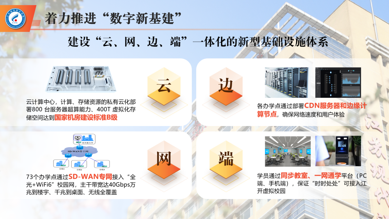 近年来,学校深入推进“以数据治理为中心”的教育数字化转型,打造了“云、网、边、端”一体化的新型基础设施体系、基于“一网承载”的“信息高速公路”、高性能云计算数据中心与智慧教育空间融合的“数字新基建”。将信息技术深度融合于教育教学和管理服务的全过程,打造智慧环境、智慧教学、融合服务、资源共享、智慧决策五类重点应用,全面实现“服务学习、服务教学、服务治理、服务决策、服务合作”的“互联网+教育”服务新生态,创新人才培养新模式,探索数字化时代学校治理新模式。