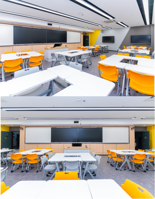 4间精品智慧教室聚焦互动教学需求,打破直排布局限制,采用灵活组合式桌椅,可快速切换“小组研讨”“项目协作”“成果展示” 等空间形态,适配翻转课堂、案例教学、项目式学习等新型教学模式。同时,“一体化智能物联管控系统”实现设备联动,“一师两麦”保障教学声音清晰传递,“人体工学升降讲台”减轻教师教学负担,细节设计既贴合教学实际,又彰显数智化教学的人文关怀,让技术真正服务于教学全过程。