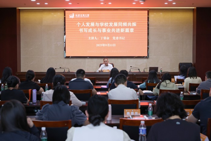 校党委书记丁荣余作题为《个人发展与学校发展同频共振 书写成长与事业共进新篇章》的辅导报告