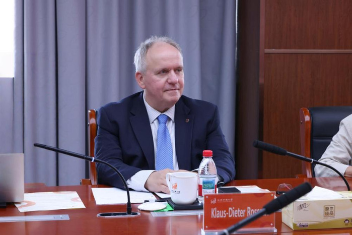 Klaus-Dieter Rossade教授回顾了两校的合作历程,并介绍了英国开放大学WELS学部的学科布局和重点研究领域。他表示,英国开放大学高度重视与江苏开放大学的合作伙伴关系,希望以此次访问为契机,进一步推动教育资源共享,拓展在教师发展、国际中文教育、教育技术应用等领域的合作。