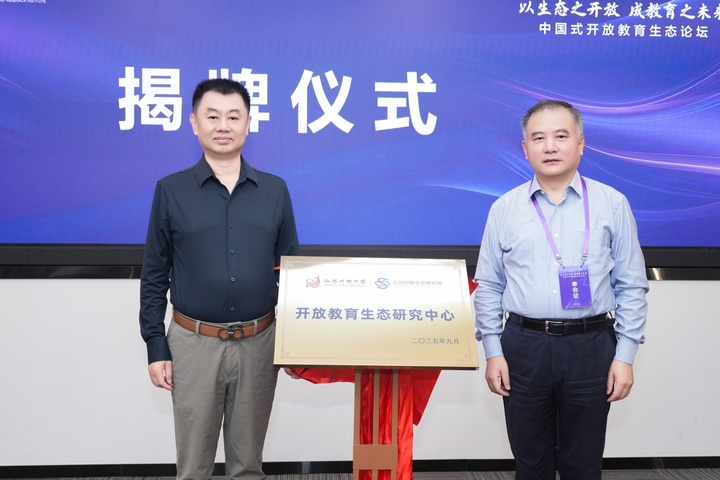 在与会嘉宾的共同见证下,袁靖宇与江苏开放大学党委书记丁荣余为开放教育生态研究中心揭牌,正式开启探索中国式开放教育生态的新征程。研究中心将深入探索中国式开放教育生态的独特发展机理,构建服务全民终身学习的开放教育新生态,打造终身化、数字化、协同化的开放教育新范式,形成全域联动、资源共享、创新活跃的共同体,为中国式开放教育生态发展贡献“江苏方案”。
