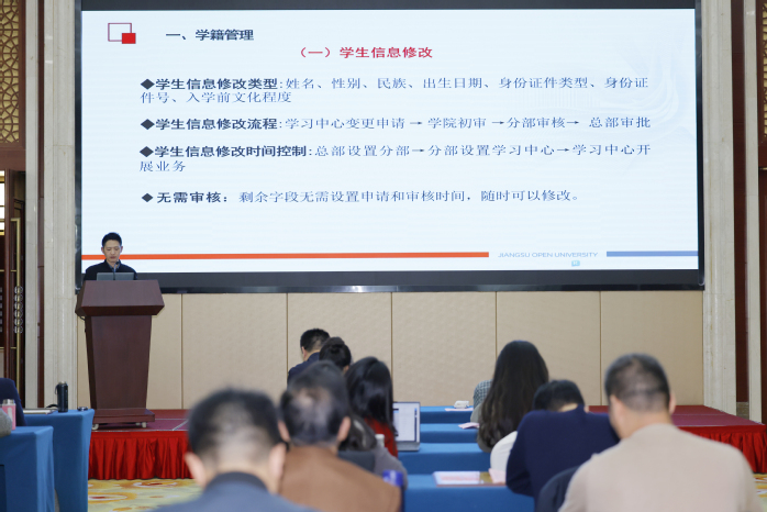 会议围绕总结过往、部署当下、培训赋能三大核心议题有序推进,国开分部教管中心党总支书记袁寿荣从党建引领教学的角度深刻阐释工作方向,为后续教学管理工作锚定坐标;教管中心主任沈宏结合开放教育发展实际,提出四点关键建议:强化政策学习、建强管理队伍、深化学情调研、坚持“以查促改、以查促管”,借综合教学检查补短板、抓规范,推动办学规范度与治理能力双提升;教管中心副主任吕赟全面回顾2024年教学检查工作,系统梳理工作中的成效与不足,并进一步明确2025年综合教学检查的重点任务与实施路径;为一步激发系统内办学活力,教管中心副主任陈国久现场宣读2024年度网上教学优秀单位获奖决定并颁发荣誉,以先进标杆带动整体教学质量提升。