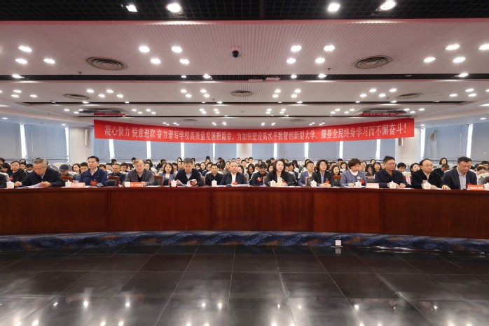大会在庄严的国歌声中开幕。校党委副书记、校长张迎春作题为《团结奋进,开拓创新,奋力开创学校事业高质量发展新局面》的工作报告。全面回顾了过去一年多来学校各项工作取得的突出成绩,明确了下一阶段学校发展的主要任务与方向。一年多来,全校上下以习近平新时代中国特色社会主义思想为指导,深入学习贯彻党的二十大和二十届历次全会精神,全面落实立德树人根本任务,奋力推进学校事业高质量发展。在党建引领、内涵发展、终身学习服务、对外合作、大学治理、民生工程等十个方面取得了显著成绩,这些成绩的取得凝聚了全校教职员工的主动担当、锐意进取。