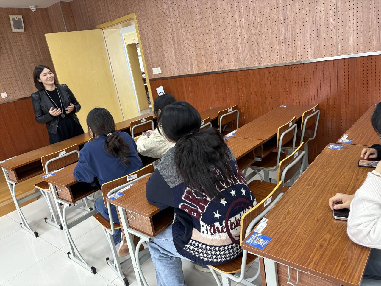 此外,在本次线下实训活动中,还特别邀请了青年昆曲演员沈芷绮进入课堂与学生分享,为课堂注入鲜活的行业视角。作为活跃在昆曲舞台的新生代力量,沈芷绮曾在《牡丹亭》《长生殿》等经典剧目中饰演重要角色,拥有丰富的舞台表演经验。分享中,她结合自身从艺经历,向学生们细致讲解昆曲表演中“唱、念、做、打”的技法要点,现场示范了水袖、兰花指等经典戏曲动作的标准姿态与情感表达技巧。此外,她还分享了戏曲造型在角色理解、情绪代入、舞台应变等方面的经验,通过“理论讲解+现场示范+互动答疑”的形式,让大家直观感受到专业戏曲演员的职业素养与表演精髓,进一步拉近了课堂学习与行业实践的距离。