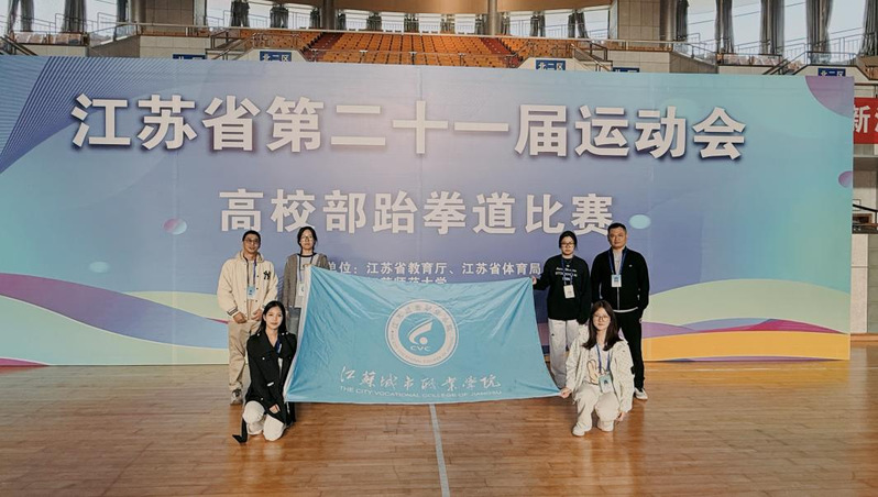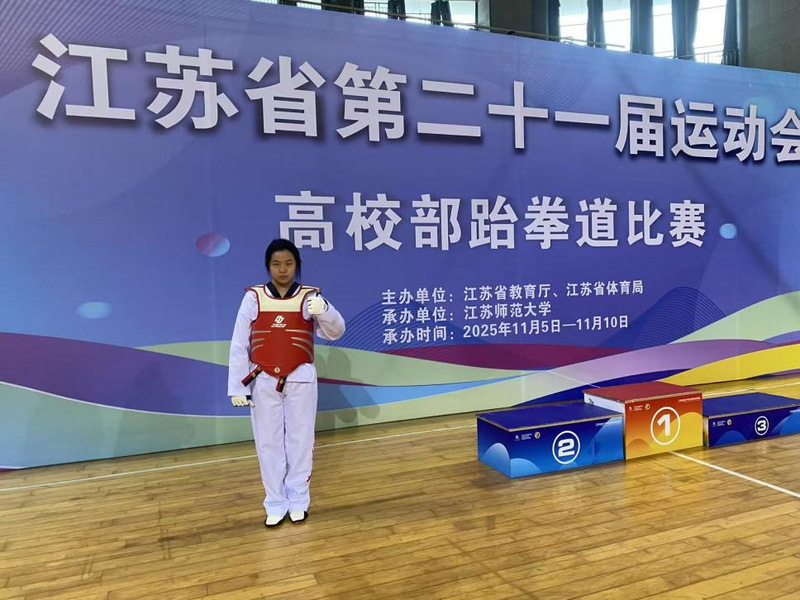 江苏省第21届大学生运动会跆拳道项目近日在江苏师范大学落下帷幕。我校环境生态学院王天楠、何欣妍、施京雪、张美月四名同学首次参加该赛事。其中何欣妍同学历经多轮激烈角逐,在女子72+公斤级别赛事中奋勇争先,以出色的竞技表现斩获该级别第五名,为学校赢得荣誉,彰显了我校学子的专业素养与拼搏精神。