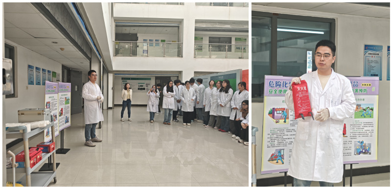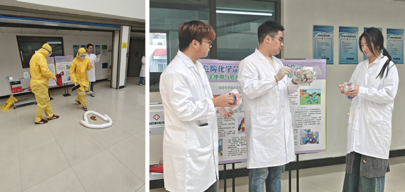 本次演练紧密结合实验室教学及科研场景中的常见安全风险点科学设置科目,重点聚焦实战化应急处置能力提升。在核心环节——重铬酸钾泄露模拟演练中,实训中心王新典、戚琳两位老师率先示范,严格遵循应急预案流程,迅速穿戴好专业防护装备,精准运用吸附材料对泄漏物进行围挡、收集与规范处理。整套操作衔接流畅、规范有序,充分展现了对危化品特性的精准把控和娴熟的应急处置技能,为在场新生作出了专业示范。