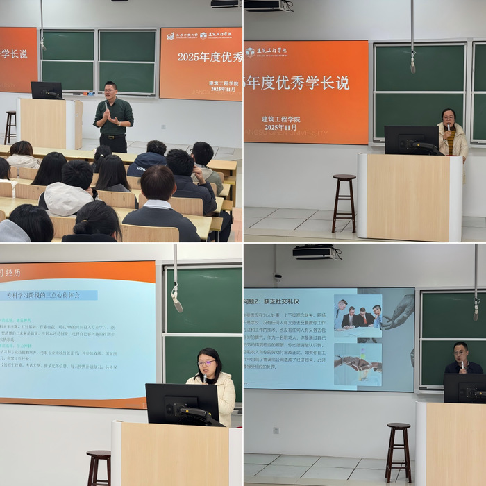 为充分发挥优秀校友的示范引领作用,帮助在校学子明晰学业规划与成长路径,建筑工程学院于2025年11月25日晚在应天校区教学楼201教室成功举办“优秀学长说”主题分享会。2024、2025级全体班团委及团学社主要学生干部共120余人参与活动。会议由院学工办主任江胜锋老师主持。