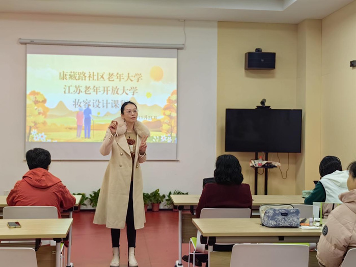 签约仪式后,来自江苏开放大学艺术学院的赵誉钦老师为辖区10余名老年朋友带来了一场生动实用的妆容设计专题讲座。活动以“自然修饰·优雅绽放”为主题,将专业美妆知识与老年人生活需求相结合,让老人们在轻松互动中解锁美丽密码,感受晚年生活的别样魅力。