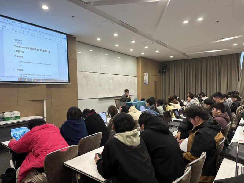 随后举行的企业宣讲会上,接待人员李永玲女士详细介绍了润和软件的发展历程、企业文化和在国产化、数字化领域的战略布局。紧接着,企业技术专家周畅为同学们带来了题为“OpenHarmony介绍与开源入门”的专题讲座。他从技术架构、生态现状与发展前景等多个维度,深入浅出地讲解了这一国产开源操作系统的核心价值,为同学们打开了通往开源世界的大门。在互动答疑环节,同学们踊跃提问,现场学术氛围浓厚。