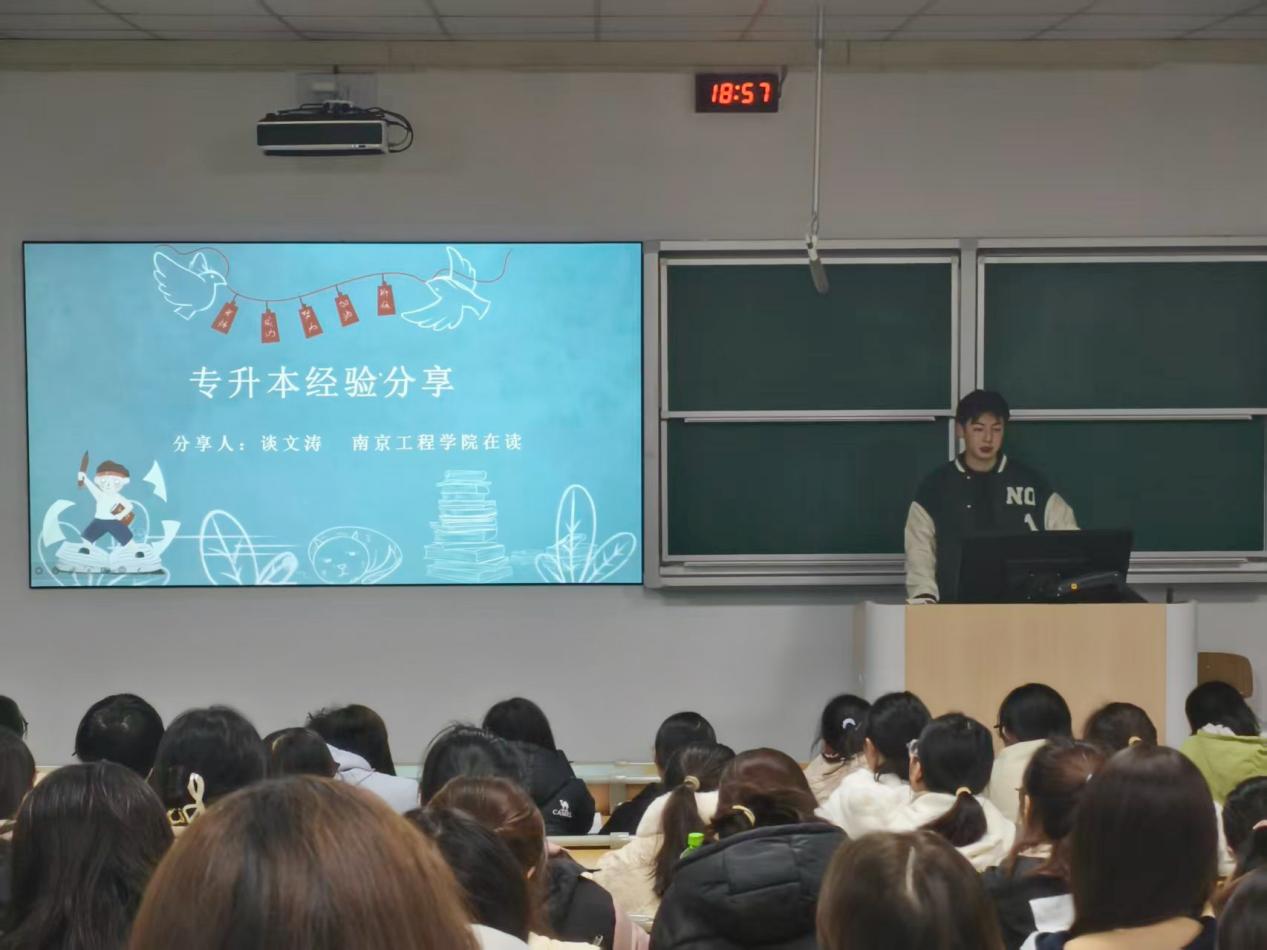 分享环节干货满满,三位优秀校友结合自身备考与升学经历,从不同维度展开细致讲解。就读于南京审计大学的左嘉欣聚焦“备考规划”,详细拆解各科目复习时间节点,推荐实用教辅资料与线上学习平台,提醒同学们结合自身基础制定个性化复习方案,避免盲目跟风;就读于南京工程学院的谈文涛围绕“高效学习方法”,分享英语词汇积累、专业课知识点梳理技巧,着重强调错题整理与复盘的重要性,建议建立专属错题本,通过反复复盘强化薄弱环节;就读于南京工业职业技术大学的陈欣雨则聚焦“备考心态与效率管理”,结合自身备考历程,建议同学们制定每日量化学习目标,通过碎片化时间高效利用、阶段性成果复盘等方式保持学习节奏,同时注重劳逸结合,避免因过度压力影响复习效果。