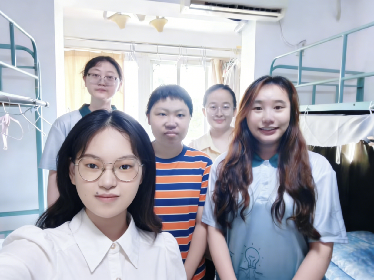2022年的夏天,蝉鸣撕开暑气的刹那,来自省内不同城市的闵晨婕、林彬、汪莹、房怡、左益菲,拖着满载憧憬的行李箱推开了环境工程技术专业4栋302A宿舍的门。彼时谁也没想到,这扇门后会藏着一段用汗水与星光浇筑的青春故事。每晚熄灯后的"卧谈会",她们半开玩笑地许下"一起去新学校读书"的约定,这句半似玩笑的话竟成了贯穿三年的奋斗誓言。