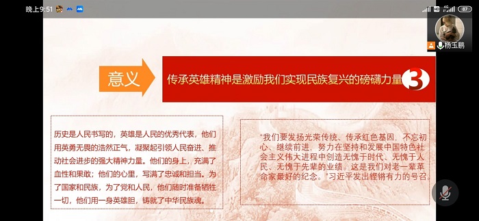 首先,由团支书带领同学们集中学习了《习近平总书记崇尚英雄缅怀英烈的重要论述》,通过学习,大家进一步了解了“一切民族英雄都是中华民族的脊梁。”这句话的深刻含义。
