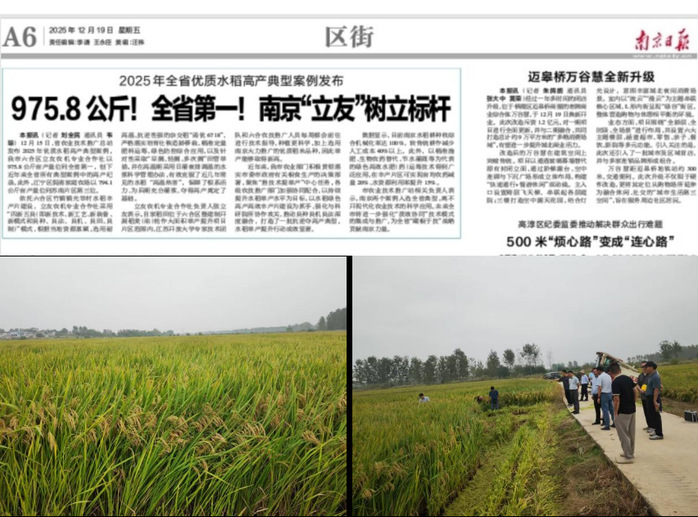 2025年12月15日,江苏省农业技术推广总站发布《2025年优质水稻高产典型案例》,我校乡村振兴学院作物育种与栽培科研团队联合南京市六合区农业技术推广部门提供技术服务的六合区立友农机专业合作社以亩产975.8公斤的优异成绩,荣登全省榜首,创下近年来全省优质水稻高产典型案例的新纪录。2025年,乡村振兴学院科研团队受南京市六合区农业农村局委托,作为核心技术支撑单位,深度参与“六合区省级稻麦高产优质片区建设项目”和“整建制推进稻麦(油)轮作大面积单产提升项目”的实施工作。项目由龙卫华教授领衔指导,学院青年教师丁超作为技术骨干全程参与实施。团队始终以“单产提升”为核心目标,通过深入调研、精准施策,制定科学高效的技术方案,并定期组织开展技术培训与现场观摩活动;依托定点监测数据,开展分类指导,切实将科研成果转化为田间实效。针对当地资源禀赋与气候特点,团队示范推广耐高温、抗逆性强的杂交水稻新品种,在关键生育期精准落实多项关键技术措施:包括壮秧适龄移栽、定量肥料运筹、绿色病虫害防控;创新采用“早搁、轻搁、多次搁”的大田水分管理策略,配合“日灌夜排”调温模式,并结合新型植物抗逆调节剂的应用,有效应对